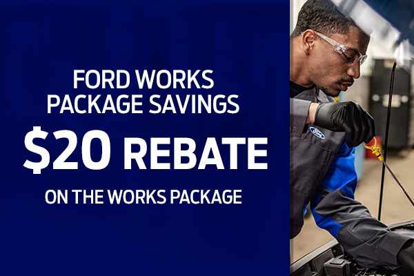 Plus tax and applicable fees. Rebate provided by Ford; valid on qualifying Works Package services. Restrictions apply. See Ford rebate terms for eligibility and submission requirements. May not be combined with any other offer. Must present coupon at time of service. Offer Expires 03/31/2026.