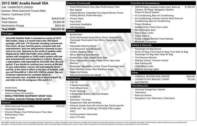 - SiriusXM Satellite Radio is standard on nearly all 2012 GM models. Enjoy a 3-month trial to the 'XM Select' package, with over 170 channels including commercial-free music, all your favorite sports, exclusive talk and entertainment. And now add premium channels to your trial at no-cost. Welcome to the world of satellite radio. (Replaced by (UBS) NavTraffic when (UUM) audio system with navigation or (U4H) audio system with rear seat entertainment and navigation is ordered. Requires a subscription sold separately by SiriusXM after the trial period. If you decide to continue your service at the end of your subscription, service will automatically renew and bill, at the rates in effect at the time of renewal, until you call SiriusXM at 1-866-635-2349 to cancel. See our Customer Agreement for complete terms at www.siriusxm.com. Available only to those at least 18 and older in the 48 contiguous USA and D.C.)