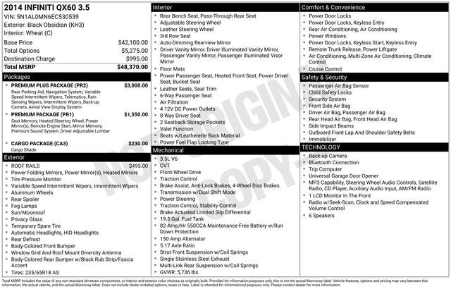 Black Obsidian 2014 INFINITI QX60 FWD Sport-Tuned CVT 3.5L V6 18 Split 5-Spoke Aluminum-Alloy Wheels, 2-Way Driver's Seat Power Lumbar Support, 3rd row seats: bench, 4-Wheel Disc Brakes, 5.17 Axle Ratio, 6 Speakers, ABS brakes, Activation Disclaimer, Air Conditioning, Alloy wheels, AM/FM radio: SiriusXM, AM/FM/CD/MP3 Audio System, Around View Monitor w/Front & Rear Sonar System, Auto-dimming Rear-View mirror, Automatic temperature control, Bodyside moldings, Brake assist, Bumpers: body-color, Cargo Package (PIO), CD player, Delay-off headlights, Driver door bin, Driver vanity mirror, Dual front impact airbags, Dual front side impact airbags, Dual Occupant Memory System, Electronic Stability Control, Enhanced Intelligent Key Memory, Entry & Exit Assist, Exterior Parking Camera Rear, First Aid Kit, Floor Mats, Four wheel independent suspension, Front anti-roll bar, Front Bucket Seats, Front Center Armrest w/Storage, Front dual zone A/C, Front fog lights, Front reading lights, Fully automatic headlights, Garage door transmitter, Heated door mirrors, Heated Front Seats, Heated front seats, Heated Steering Wheel, High intensity discharge headlights: Bi-Xenon, Illuminated entry, INFINITI Hard Drive Navigation System, INFINITI Voice Recognition, Leather Shift Knob, Leather steering wheel, Leather-Appointed Seats, Literature Kit, Low tire pressure warning, Occupant sensing airbag, Outside Mirrors w/Reverse Tilt-Down Feature, Outside temperature display, Overhead airbag, Overhead console, Panic alarm, Passenger door bin, Passenger vanity mirror, Power door mirrors, Power driver seat, Power Liftgate, Power moonroof, Power passenger seat, Power steering, Power windows, Premium Package, Premium Plus Package, Radio data system, Radio: AM/FM/CD/DVD w/MP3 Playback Capability, Rain-Sensing Front Windshield Wipers, Rear air conditioning, Rear anti-roll bar, Rear Cargo Protector, Rear reading lights, Rear seat center armrest, Rear window defroster, Rear window wiper, Reclining 3rd row seat, Remote Engine Start, Remote keyless entry, Roof Rails, Security system, Speed control, Speed-sensing steering, Speed-Sensitive Wipers, Split folding rear seat, Spoiler, Steering wheel mounted audio controls, Tachometer, Telescoping steering wheel, Tilt steering wheel, Tonneau Cover, Traction control, Trip computer, Variably intermittent wipers.