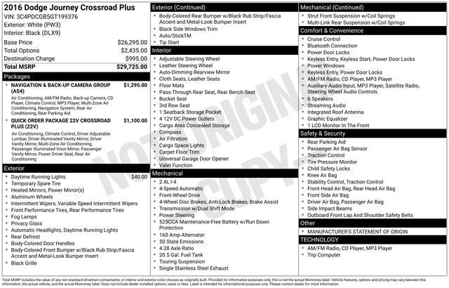 Priced below KBB Fair Purchase Price! White 2016 Dodge Journey Crossroad FWD 4-Speed Automatic VLP 2.4L I4 DOHC 16V Dual VVT 3rd row seats: bench, 4-Wheel Disc Brakes, 4.28 Axle Ratio, 5-Year SiriusXM Traffic Service, 5-Year SiriusXM Travel Link Service, 6 Speakers, 8.4 Touchscreen Display, ABS brakes, Air Conditioning, Alloy wheels, AM/FM radio: SiriusXM, Anti-whiplash front head restraints, ATC w/3-Zone Temperature Control, Auto-dimming Rear-View mirror, Auto/StickTM, Brake assist, Bumpers: body-color, Cargo Net, CD player, Compass, Crossroad Equipment Group, Delay-off headlights, Driver door bin, Driver vanity mirror, Dual front impact airbags, Dual front side impact airbags, Electronic Stability Control, Four wheel independent suspension, Front & Rear Aimable LED Lamps, Front anti-roll bar, Front Bucket Seats, Front Center Armrest, Front dual zone A/C, Front fog lights, Front Passenger Forward Fold Flat Seat, Front reading lights, Garmin Navigation System, Heated door mirrors, Illuminated entry, Interior Observation Mirror, Knee airbag, Leather Seats w/Sport Mesh Inserts, Leather Wrapped Shift Knob, Leather Wrapped Steering Wheel, Light Gray Accent Stitching, Low tire pressure warning, Manufacturer's Statement of Origin, Navigation & Back-Up Camera Group, Occupant sensing airbag, Outside temperature display, Overhead airbag, Overhead Console, Overhead console, Panic alarm, ParkSense Rear Park Assist System, ParkView Rear Back-Up Camera, Passenger Assist Handles, Passenger door bin, Passenger In Seat Cushion Storage, Passenger vanity mirror, Power 4-Way Driver Lumber Adjust, Power 6-Way Driver Seat, Power door mirrors, Power steering, Power windows, Premium Cloth Low-Back Bucket Seats, Premium Door Trim Panel w/Stitching, Quick Order Package 22V Crossroad Plus, Radio data system, Radio: 4.3, Radio: 8.4, Radio: 8.4 Navigation, Rear air conditioning, Rear anti-roll bar, Rear reading lights, Rear seat center armrest, Rear window defroster, Rear window wiper, Reclining 3rd row seat, Remote keyless entry, Roof rack: rails only, SiriusXM Traffic, SiriusXM Travel Link, Speed control, Speed-sensing steering, Speed-Sensitive Wipers, Split folding rear seat, Steering wheel mounted audio controls, Sun Visors w/Illuminated Vanity Mirrors, Tachometer, Telescoping steering wheel, Tilt steering wheel, Tip Start, Touring Suspension, Traction control, Trip computer, Universal Garage Door Opener, Variably intermittent wipers, Wheels: 19 x 7 Hyper Black Aluminum.