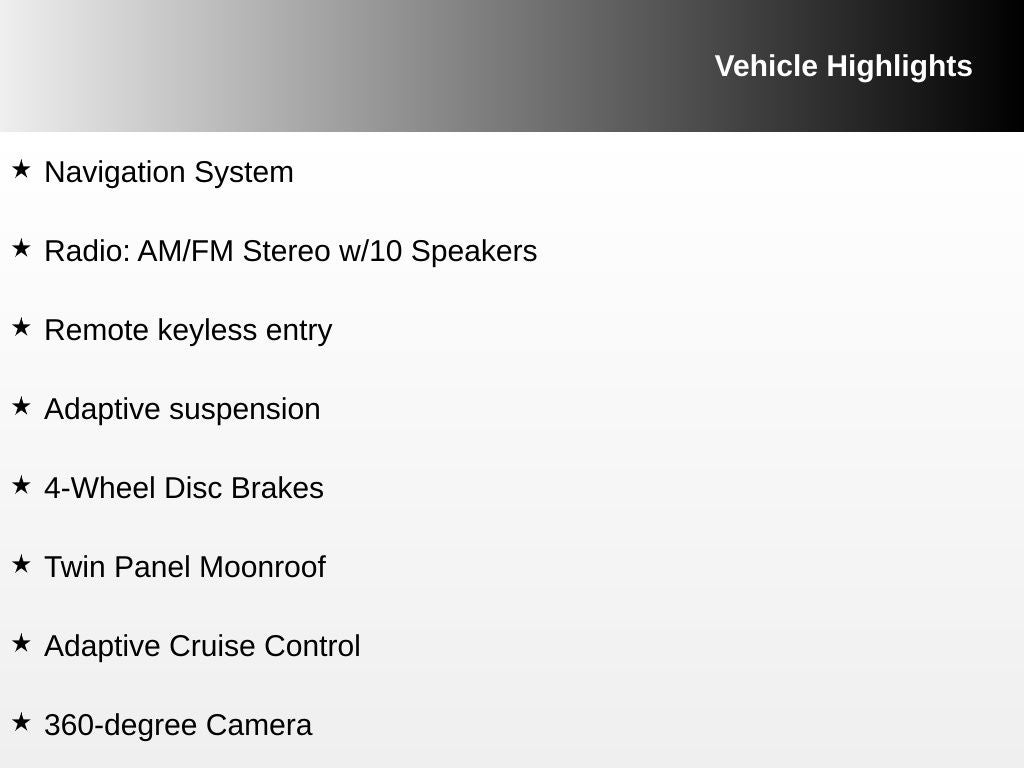 - Radio: AM/FM Stereo w/10 Speakers -inc: SiriusXM radio (48 contiguous states) w/6-month prepaid subscription Service not available in AK/HI.