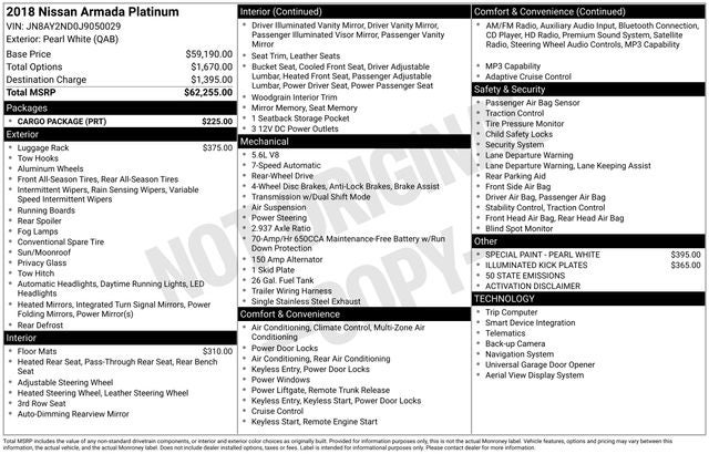 13 Speakers, 2.937 Axle Ratio, 2nd & 3rd Row Carpeted Mats, 3rd row seats: split-bench, 4-Wheel Disc Brakes, A/V remote, ABS brakes, Activation Disclaimer, Air Conditioning, Alloy wheels, AM/FM radio: SiriusXM, Anti-whiplash front head restraints, Auto tilt-away steering wheel, Auto-dimming door mirrors, Auto-dimming Rear-View mirror, Auto-leveling suspension, Automatic temperature control, Brake assist, Bumpers: body-color, Cargo Package, CD player, Delay-off headlights, Driver door bin, Driver vanity mirror, Dual front impact airbags, Dual front side impact airbags, Electronic Stability Control, Emergency communication system: NissanConnect Services, Four wheel independent suspension, Front anti-roll bar, Front Bucket Seats, Front Center Armrest, Front dual zone A/C, Front fog lights, Front reading lights, Fully automatic headlights, Garage door transmitter: HomeLink, Headphones, Heated & Cooled Front Bucket Seats w/Driver Memory, Heated door mirrors, HEATED FRONT SEATS, Heated rear seats, Heated steering wheel, Illuminated entry, Illuminated Kick Plates, Lane Departure Warning System, Leather Shift Knob, Leather-Appointed Seat Trim, Low tire pressure warning, Memory seat, NAVIGATION, Occupant sensing airbag, Outside temperature display, Overhead airbag, Overhead console, Panic alarm, Passenger door bin, Passenger vanity mirror, Power door mirrors, Power driver seat, Power Liftgate, Power moonroof, Power passenger seat, Power steering, Power windows, Radio data system, Radio: Bose AM/FM/SXM/CD/MP3/HD Radio, Rain sensing wipers, Rear air conditioning, Rear anti-roll bar, Rear reading lights, Rear seat center armrest, Rear window defroster, Rear window wiper, Reclining 3rd row seat, Remote keyless entry, Roof rack: rails only, Roof Rail Cross Bars, Security system, Special Paint - Pearl White, Speed control, Speed-sensing steering, Speed-Sensitive Wipers, Split folding rear seat, Spoiler, Steering wheel memory, Steering wheel mounted audio controls, Tachometer, Telescoping steering wheel, Tilt steering wheel, Traction control, Trip computer, Turn signal indicator mirrors, Variably intermittent wipers, Ventilated front seats, Voltmeter, Wheels: 20 Machine-Faced Chrome w/Tinted CC.
