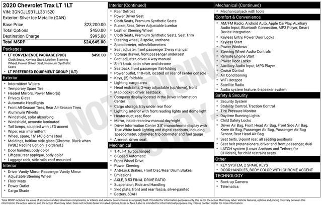 CARFAX One-Owner. Priced below KBB Fair Purchase Price! Silver Ice Metallic 2020 Chevrolet Trax LT FWD 6-Speed Automatic ECOTEC 1.4L I4 SMPI DOHC Turbocharged VVT 16 Aluminum Wheels, 2 Spare Keys Key System, 2 USB Ports w/Auxiliary Input Jack, 2-Way Manual Front Passenger Seat Adjuster, 3-Spoke Leather-Wrapped Steering Wheel, 3.53 Final Drive Axle Ratio, 4-Way Manual Driver Seat Adjuster, 6 Speakers, 6-Speaker Audio System Feature, 6-Way Power Driver Seat Adjuster, ABS brakes, Air Conditioning, Alloy wheels, AM/FM radio: SiriusXM, Apple CarPlay/Android Auto, Body-Color Door Handles, Body-Color Door Handles w/Chrome Accent, Brake assist, Bumpers: body-color, Compass, Delay-off headlights, Deluxe Cloth Seat Trim, Deluxe Cloth/Leatherette Seat Trim, Driver door bin, Driver vanity mirror, Driver's Seat Mounted Armrest, Dual front impact airbags, Dual front side impact airbags, Electronic Stability Control, Emergency communication system: OnStar and Chevrolet connected services capable, Exterior Parking Camera Rear, Front anti-roll bar, Front Bucket Seats, Front Bucket Seats w/Driver Power Lumbar, Front reading lights, Front wheel independent suspension, Fully automatic headlights, Heated door mirrors, Illuminated entry, Keyless Open, Keyless Start, Knee airbag, Low tire pressure warning, LT Convenience Package, Occupant sensing airbag, Outside temperature display, Overhead airbag, Panic alarm, Passenger door bin, Passenger vanity mirror, Power door mirrors, Power steering, Power windows, Preferred Equipment Group 1LT, Premium audio system: Chevrolet MyLink, Radio data system, Radio: Chevrolet Infotainment 3 System, Rear seat center armrest, Rear side impact airbag, Rear window defroster, Rear window wiper, Remote keyless entry, Roof rack: rails only, Security system, SiriusXM Radio, Speed control, Split folding rear seat, Spoiler, Steering wheel mounted audio controls, Tachometer, Telescoping steering wheel, Tilt steering wheel, Traction control, Trip computer, Variably intermittent wipers.