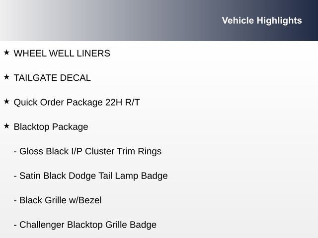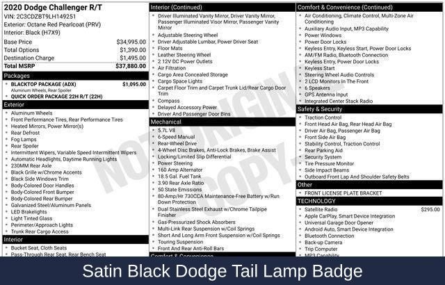 - Blacktop Package: Black Fuel Filler Door, Gloss Black I/P Cluster Trim Rings, Rear Black Spoiler, HEMI Blacktop Fender Badge, Satin Black Dodge Tail Lamp Badge, Blacktop R/T Badge, 20 Black Noise Painted Wheels, Black Grille with Bezel, Challenger Blacktop Grille Badge
