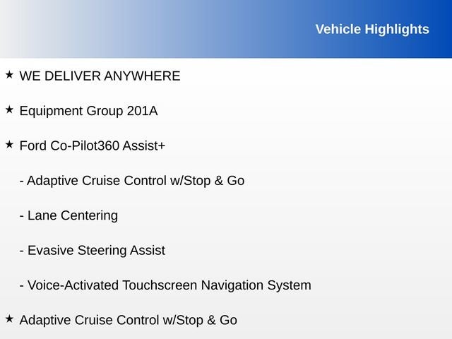 - SYNC 3 Communications & Entertainment System -inc: enhanced voice recognition, 8" LCD capacitive touchscreen in center stack w/swipe capability, AppLink, 911 Assist, Apple CarPlay and Android Auto compatibility and 2 smart-charging multimedia USB ports
