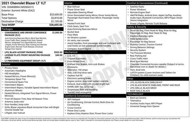 This 2021 Chevrolet Blazer LT is the perfect blend of style, technology, and capability. Experience the difference for yourself by scheduling a test drive today. We're confident you'll be impressed by its exceptional value and the exceptional customer service you'll receive at our dealership.