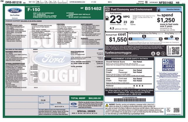 Carbonized Gray Metallic 2022 Ford F-150 XLT 4WD 10-Speed Automatic 3.5L PowerBoost Full-Hybrid V6 WE DELIVER ANYWHERE, 3.5L PowerBoost Full-Hybrid V6, 4WD, 10-Way Power Driver & Passenger Seats, 8 Productivity Screen in Instrument Cluster, Accent-Color Step Bars, Bed Utility Package, Black 2-Bar Style Grille w/Black Surround/Accents, Body-Color Door & Tailgate Handles, Body-Color Front & Rear Bumpers, Box Side Decals, BoxLink, Class IV Trailer Hitch Receiver, Dual Zone Electronic Automatic Temperature Control, Equipment Group 302A High, Extended Range 36 Gallon Fuel Tank, Heated Front Seats, Integrated Trailer Brake Controller, Intelligent Access w/Push Button Start, Leather-Wrapped Steering Wheel, LED Box Lighting, LED Reflector Headlamps, LED Sideview Mirror Spotlights, Max Trailer Tow Package, Onboard 400W Outlet, Power Glass Heated Sideview Mirrors, Pro Trailer Backup Assist, Rear Under-Seat Storage, Remote Start System w/Remote Tailgate Release, SYNC 4 w/Enhanced Voice Recognition, Tailgate Step w/Tailgate Work Surface, Unique Sport Cloth 40/Console/40 Front-Seats, Wheels: 18 6-Spoke Machined Aluminum, XLT Sport Appearance Package, Zone Lighting, 3.31 Axle Ratio, 4-Wheel Disc Brakes, 6 Speakers, ABS brakes, Air Conditioning, Alloy wheels, AM/FM radio, Auto High-beam Headlights, Auto Start-Stop Removal, Auto-Dimming Rear-View Mirror, Brake assist, Bumpers: chrome, Cloth 40/20/40 Front Seat, Compass, Delay-off headlights, Driver door bin, Driver vanity mirror, Dual front impact airbags, Dual front side impact airbags, Electronic Locking w/3.73 Axle Ratio, Electronic Stability Control, Emergency communication system: SYNC 4 911 Assist, Exterior Parking Camera Rear, Front anti-roll bar, Front Center Armrest w/Storage, Front fog lights, Front reading lights, Front wheel independent suspension, Fully automatic headlights, Heated door mirrors, Illuminated entry, Low tire pressure warning, Occupant sensing airbag, Outside temperature display, Overhead airbag, Overhead console, Panic alarm, Passenger door bin, Passenger vanity mirror, Power door mirrors, Power steering, Power windows, Radio data system, Radio: AM/FM SiriusXM w/360L, Radio: AM/FM Stereo w/6 Speakers, Rear reading lights, Rear step bumper, Rear window defroster, Remote keyless entry, Remote Start System, Security system, Speed control, Speed-sensing steering, Split folding rear seat, Steering wheel mounted audio controls, SYNC 4, Tachometer, Telescoping steering wheel, Tilt steering wheel, Traction control, Tray Style Floor Liner (47W), Trip computer, Variably intermittent wipers, Voltmeter, Wheels: 17 Silver Painted Aluminum, Wheels: 20 6-Spoke Dark Alloy Painted Aluminum, 3.5L PowerBoost Full-Hybrid V6, 4WD, 10-Way Power Driver & Passenger Seats, 8 Productivity Screen in Instrument Cluster, Accent-Color Step Bars, Bed Utility Package, Black 2-Bar Style Grille w/Black Surround/Accents, Body-Color Door & Tailgate Handles, Body-Color Front & Rear Bumpers, Box Side Decals, BoxLink, Class IV Trailer Hitch Receiver, Dual Zone Electronic Automatic Temperature Control, Equipment Group 302A High, Extended Range 36 Gallon Fuel Tank, Heated Front Seats, Integrated Trailer Brake Controller, Intelligent Access w/Push Button Start, Leather-Wrapped Steering Wheel, LED Box Lighting, LED Reflector Headlamps, LED Sideview Mirror Spotlights, Max Trailer Tow Package, Onboard 400W Outlet, Power Glass Heated Sideview Mirrors, Pro Trailer Backup Assist, Rear Under-Seat Storage, Remote Start System w/Remote Tailgate Release, SYNC 4 w/Enhanced Voice Recognition, Tailgate Step w/Tailgate Work Surface, Unique Sport Cloth 40/Console/40 Front-Seats, Wheels: 18 6-Spoke Machined Aluminum, XLT Sport Appearance Package, Zone Lighting.