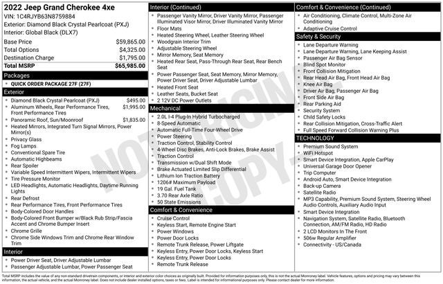10 Speakers, 10.1 Touchscreen Display, 3.70 Rear Axle Ratio, 4-Wheel Disc Brakes, 4G LTE Wi-Fi Hot Spot, ABS brakes, Air Conditioning, All Radio Equipped Vehicles, Alloy wheels, AM/FM radio: SiriusXM with 360L, Anti-whiplash front head restraints, Apple CarPlay, Audio memory, Auto High-beam Headlights, Automatic temperature control, Brake assist, Bumpers: body-color, Capri Leather Seats, Compass, Connected Travel & Traffic Services, Connectivity - US/Canada, Delay-off headlights, Disassociated Touchscreen Display, Driver door bin, Driver vanity mirror, Dual front impact airbags, Dual front side impact airbags, Dual-Pane Panoramic Sunroof (DISC), Electronic Stability Control, For Details, Visit DriveUconnect.com, For More Info, Call 800-643-2112, Four wheel independent suspension, Front anti-roll bar, Front Bucket Seats, Front Center Armrest w/Storage, Front dual zone A/C, Front fog lights, Front Passenger Interactive Display, Front reading lights, Fully automatic headlights, Garage door transmitter, Global Telematics Box Module (TBM), Google Android Auto, GPS Antenna Input, GPS Navigation, HD Radio, Heated door mirrors, HEATED FRONT SEATS, Heated rear seats, Heated steering wheel, Heavy Duty Suspension, Illuminated entry, Integrated Center Stack Radio, Integrated Voice Command w/Bluetooth®, Knee airbag, Leather steering wheel, Low tire pressure warning, Memory seat, Occupant sensing airbag, Outside temperature display, Overhead airbag, Overhead console, Panic alarm, ParkView Rear Back-Up Camera, Passenger door bin, Passenger vanity mirror, Power door mirrors, Power driver seat, Power Liftgate, Power passenger seat, Power steering, Power windows, Pur Wrapped Instrument Panel, Quick Order Package 27F, Radio data system, Radio: Uconnect 5 Nav w/10.1 Display, Radio: Uconnect 5 w/8.4 Display, Rear anti-roll bar, Rear reading lights, Rear window defroster, Rear window wiper, Remote keyless entry, Roof rack: rails only, Security system, SiriusXM Radio Service, SiriusXM Satellite Radio, SiriusXM w/360L, Speed control, Speed-Sensitive Wipers, Split folding rear seat, Spoiler, Steering wheel mounted audio controls, Tachometer, Telescoping steering wheel, Tilt steering wheel, Traction control, Trip computer, Turn signal indicator mirrors, USB Host Flip, Variably intermittent wipers, Voltmeter, Wheels: 18 x 8 Fully Painted Aluminum.