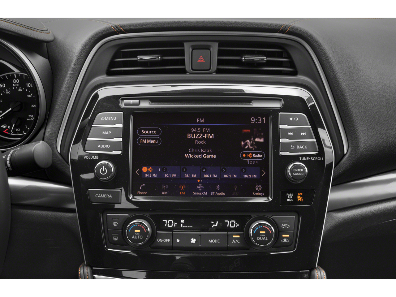 • Radio: AM/FM/CD Bose Audio System -inc: MP3/WMA/AUX reader, 11 speakers, NissanConnect featuring 8" color display w/multi-touch control, Apple CarPlay, Android Auto, 2 front illuminated USB connection ports (1 Type-A, 1 Type-C), rear USB ports (charge only, 1 Type-A, 1 Type-C), Bluetooth® hands-free phone system, hands-free text messaging assistant, streaming audio via Bluetooth®, voice recognition, Siri Eyes Free, SiriusXM radio, SiriusXM advanced audio features, NissanConnect services powered by SiriusXM, Wi-Fi hotspot, Nissan door to door navigation, SiriusXM Traffic, SiriusXM Travel Link, display commander and 7" Advanced Drive Assist Display (ADAD)