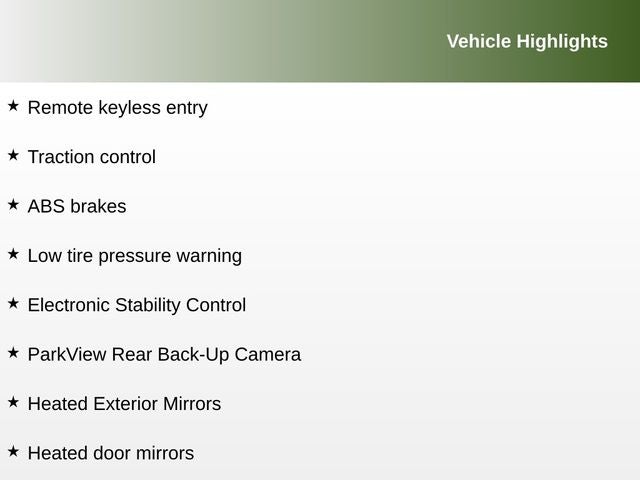 ABS brakes, Alloy wheels, Compass, Electronic Stability Control, Front Heated Seats, Heated door mirrors, Heated Exterior Mirrors, Heated front seats, Illuminated entry, Low tire pressure warning, ParkView Rear Back-Up Camera, Remote keyless entry, Traction control.
