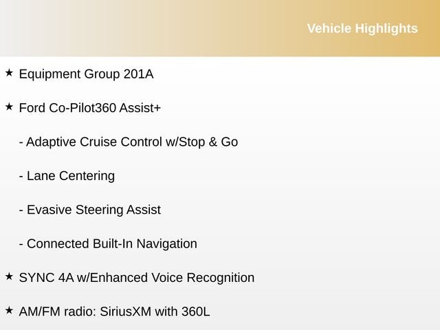 • FORD CO-PILOT360 ASSIST+, featuring Evasive Steering Assist, Connected Built-In Navigation with 3 years of service, and Adaptive Cruise Control with Stop & Go and Lane Centering