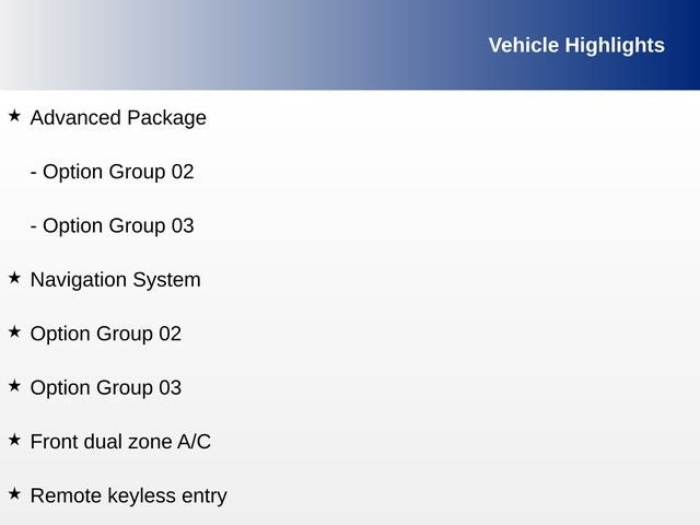 ABS brakes, Advanced Package, Alloy wheels, Electronic Stability Control, Emergency communication system, Front dual zone A/C, Heated door mirrors, Heated Front Bucket Seats, Heated front seats, Illuminated entry, Low tire pressure warning, Navigation System, Option Group 02, Option Group 03, Power Liftgate, Remote keyless entry, Traction control.