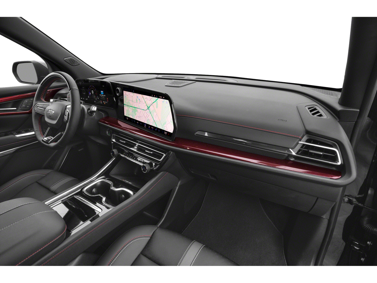 The interior of the Traverse RS is meticulously crafted, featuring perforated leather-appointed seating, heated and ventilated front seats, and a heated steering wheel. The Bose Premium 10-Speaker Audio System provides an immersive listening experience, while the 17.7 diagonal display and integrated navigation system keep you connected and informed on the go.