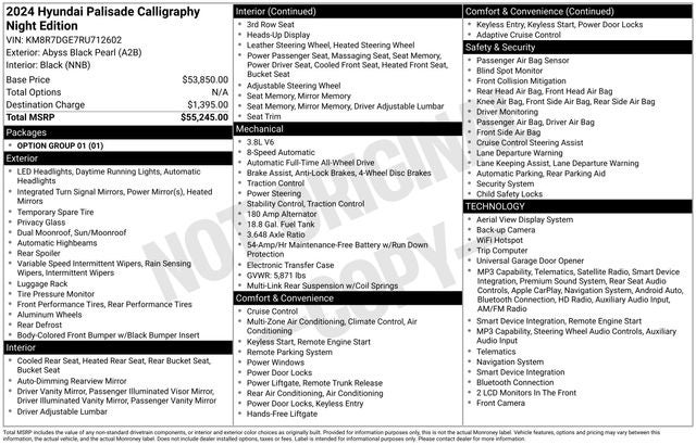Priced below KBB Fair Purchase Price! Abyss Black Pearl 2024 Hyundai Palisade Calligraphy Night Edition AWD 8-Speed Automatic with SHIFTRONIC V6 12 Speakers, 3.648 Axle Ratio, 3rd row seats: split-bench, 4-Wheel Disc Brakes, ABS brakes, Air Conditioning, Alloy wheels, AM/FM radio: SiriusXM, Apple CarPlay & Android Auto, Auto High-beam Headlights, Auto-dimming door mirrors, Auto-dimming Rear-View mirror, Auto-leveling suspension, Automatic temperature control, Brake assist, Bumpers: body-color, Compass, Delay-off headlights, Driver door bin, Driver vanity mirror, Dual front impact airbags, Dual front side impact airbags, Electronic Stability Control, Emergency communication system, Exterior Parking Camera Rear, Four wheel independent suspension, Front anti-roll bar, Front Bucket Seats, Front Center Armrest, Front dual zone A/C, Front reading lights, Fully automatic headlights, Garage door transmitter: HomeLink, harman/kardon® Speakers, Heads-Up Display, Heated & Ventilated Front Bucket Seats, Heated door mirrors, Heated front seats, Heated rear seats, Heated steering wheel, Illuminated entry, Knee airbag, Low tire pressure warning, Memory seat, Microfiber Suede Seat Trim, Navigation System, Occupant sensing airbag, Option Group 01, Outside temperature display, Overhead airbag, Overhead console, Panic alarm, Passenger door bin, Passenger vanity mirror, Power door mirrors, Power driver seat, Power Liftgate, Power moonroof, Power passenger seat, Power steering, Power windows, Radio data system, Radio: AM/FM/MP3 Premium Audio System, Rain sensing wipers, Rear air conditioning, Rear anti-roll bar, Rear audio controls, Rear reading lights, Rear side impact airbag, Rear window defroster, Rear window wiper, Reclining 3rd row seat, Remote keyless entry, Roof rack, Security system, Speed control, Speed-sensing steering, Split folding rear seat, Spoiler, Steering wheel mounted audio controls, Tachometer, Telescoping steering wheel, Tilt steering wheel, Traction control, Trip computer, Turn signal indicator mirrors, Variably intermittent wipers, Ventilated front seats, Ventilated rear seats, Wheels: 20 x 7.5J Black Liquid Paint Alloy.
