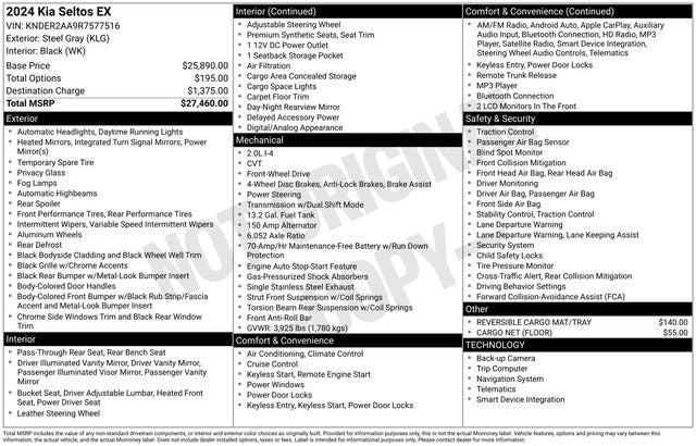 Slip behind the wheel and experience the refined 2.0L I4 MPI engine, delivering a smooth and efficient ride with an impressive 28 city/34 highway MPG. The Seltos EX's sleek, modern design and Gray exterior exude confidence, while the spacious and well-appointed interior provides a comfortable and versatile cabin for all your needs.