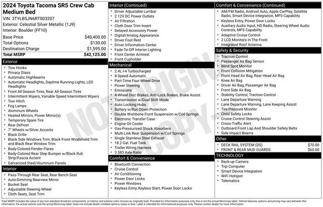 The 2024 Toyota Tacoma SR5 has also been meticulously inspected and certified, ensuring you can drive with confidence. Our rigorous multi-point inspection process covers everything from the engine and transmission to the interior and exterior, giving you peace of mind in your purchase.
