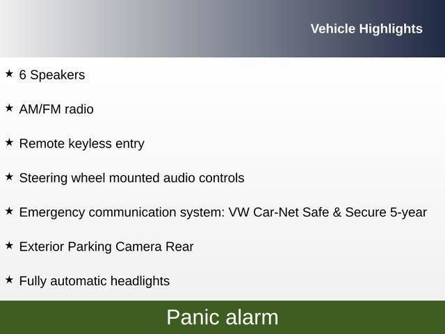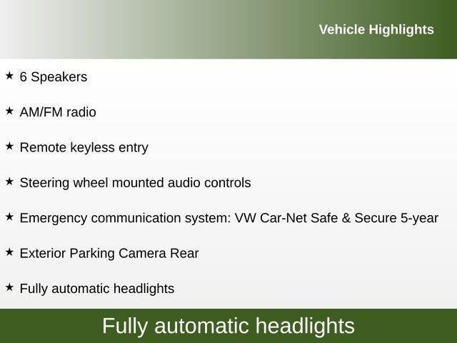 6 Speakers, Alloy wheels, AM/FM radio, Emergency communication system: VW Car-Net Safe & Secure 5-year, Exterior Parking Camera Rear, Fully automatic headlights, Heated door mirrors, Heated Front Seats, Illuminated entry, Leather Shift Knob, Panic alarm, Rain sensing wipers, Remote keyless entry, Steering wheel mounted audio controls, Wheels: 17 2-Tone Machined Twin 5-Spoke Alloy.