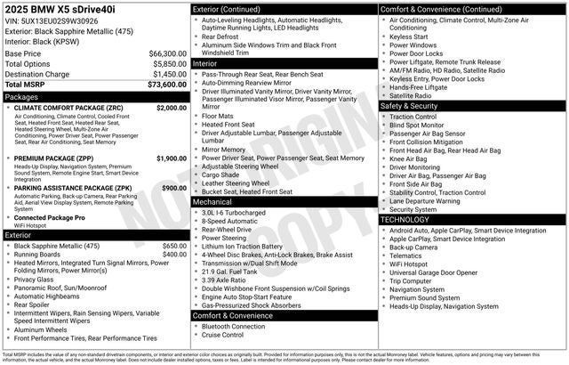 2025 BMW X5 sDrive40i Black Premium Synthetic, 4-Zone Automatic Climate Control, Active Park Distance Control, Climate Comfort Package, Connected Package Pro, Front & Rear Heated Seats, Front Ventilated Seats, Gesture Control, harman/kardon Surround Sound System, Heated Front Seats, Armrests & Steering Wheel, Live Cockpit Pro, Multi-Contour Seats, Parking Assistance Package, Parking Assistant Professional, Parking View w/3D View (Surround View), Premium Package, Rear-View Camera, Remote Engine Start.