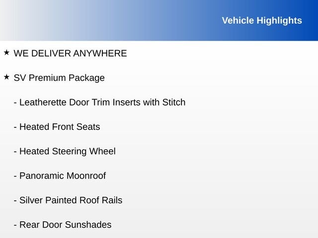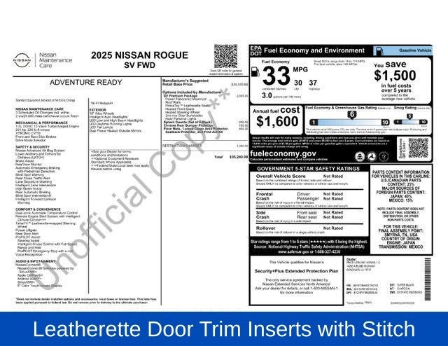 Super Black 2025 Nissan Rogue SV FWD CVT with Xtronic 1.5L DOHC WE DELIVER ANYWHERE, Heated Front Seats, Heated Steering Wheel, Leatherette Door Trim Inserts with Stitch, Panoramic Moonroof, Prima-Tex Leatherette Seat Trim, Rear Door Sunshades, Rear Personal Lights, Silver Painted Roof Rails, SV Premium Package, 4-Wheel Disc Brakes, 6 Speakers, ABS brakes, Air Conditioning, Alloy wheels, AM/FM radio: SiriusXM, Android Auto and Apple CarPlay, Auto High-beam Headlights, Automatic temperature control, Black Splash Guards (set of 4), Brake assist, Bumpers: body-color, Chrome Rear Bumper Protector, Delay-off headlights, Driver door bin, Driver vanity mirror, Dual front impact airbags, Dual front side impact airbags, Electronic Stability Control, Emergency communication system: NissanConnect Services, First Aid Kit, Floor Mats with 1-Piece Cargo Area Protector, Four wheel independent suspension, Front anti-roll bar, Front Bucket Seats, Front Bucket Seats with 8-Way Power Driver Seat, Front Center Armrest, Front dual zone A/C, Front reading lights, Fully automatic headlights, Heated door mirrors, Illuminated entry, Knee airbag, Low tire pressure warning, Occupant sensing airbag, Outside temperature display, Overhead airbag, Overhead console, Panic alarm, Passenger door bin, Passenger vanity mirror, Power door mirrors, Power driver seat, Power Liftgate, Power steering, Power windows, Radio data system, Radio: NissanConnect with 6 Speakers, Rear anti-roll bar, Rear seat center armrest, Rear side impact airbag, Rear window defroster, Rear window wiper, Remote keyless entry, Speed control, Speed-sensing steering, Speed-Sensitive Wipers, Split folding rear seat, Spoiler, Steering wheel mounted audio controls, Tachometer, Telescoping steering wheel, Tilt steering wheel, Traction control, Trip computer, Variably intermittent wipers, Wheels: 18 Dark Painted Machine Finished Alloy, Heated Front Seats, Heated Steering Wheel, Leatherette Door Trim Inserts with Stitch, Panoramic Moonroof, Prima-Tex Leatherette Seat Trim, Rear Door Sunshades, Rear Personal Lights, Silver Painted Roof Rails, SV Premium Package.